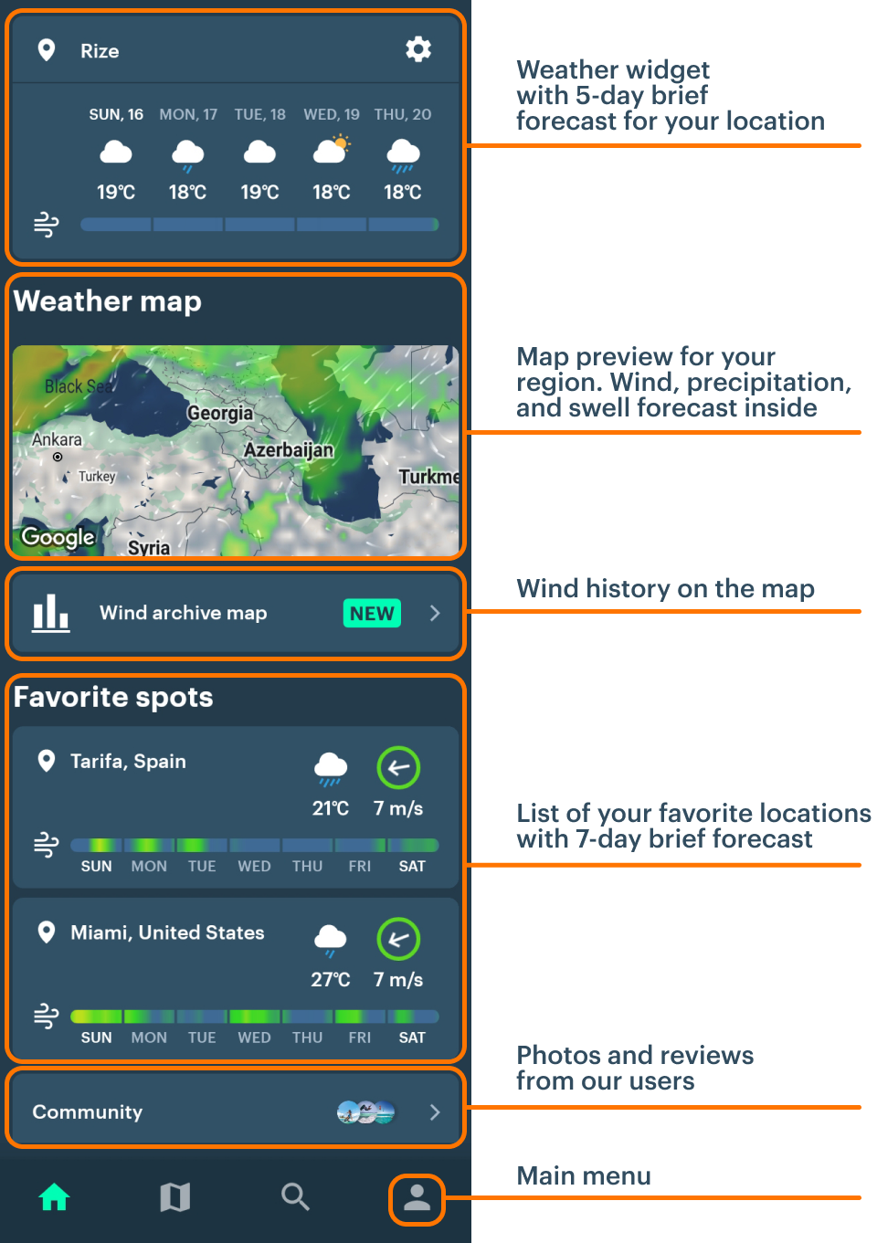 The Home Screen is what you see each time you start the app. It’s all about fast access to features — the weather map, forecasts on favorite spots, etc.