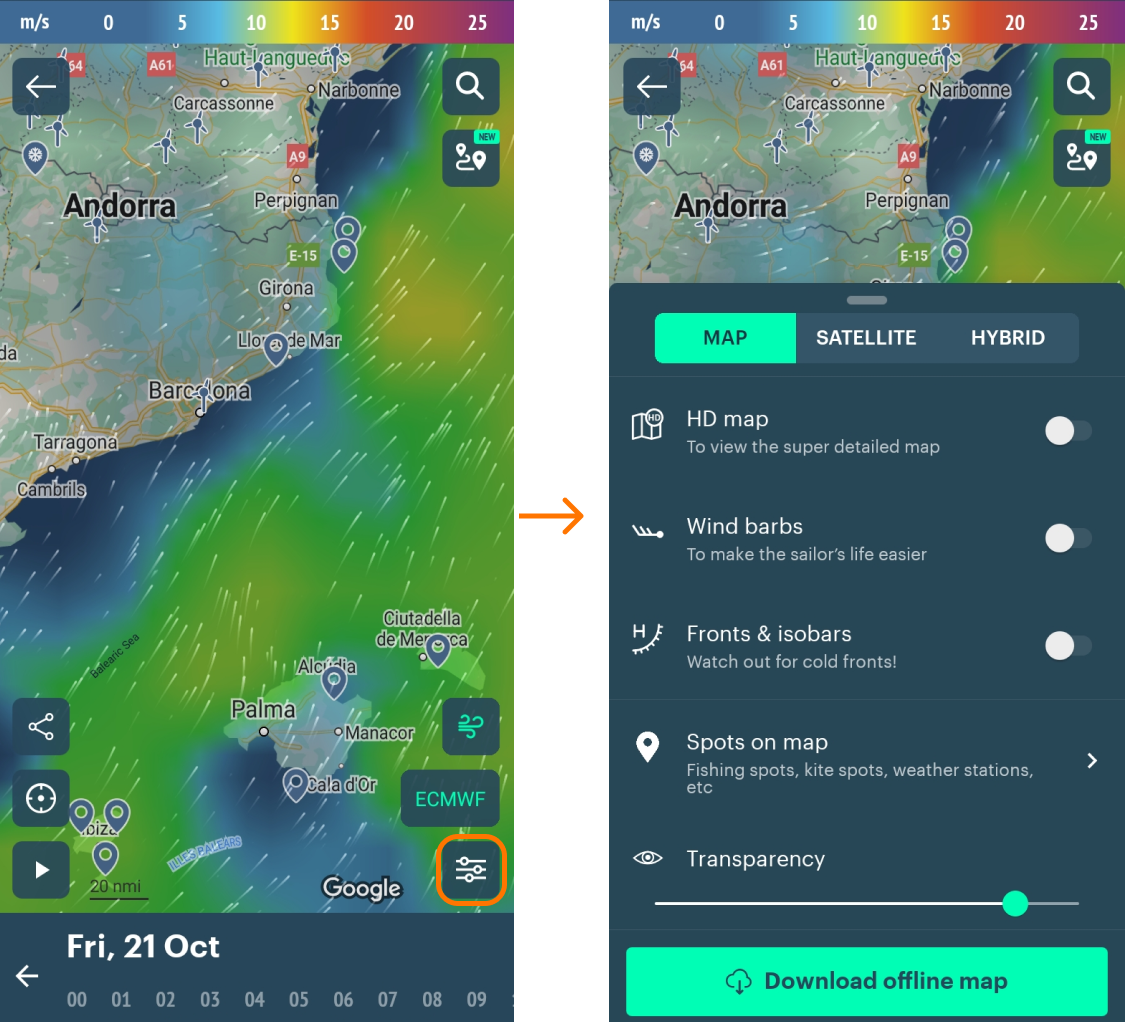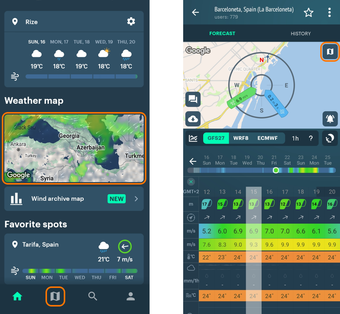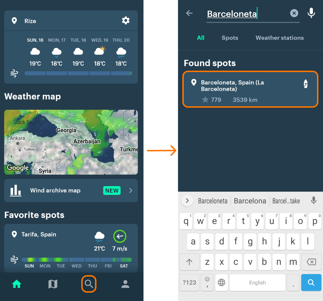 - Allow the app to access your location (turn GPS on). When you do, you’ll be able to see all the features of the home screen, including weather widget, nearest spots and weather stations: